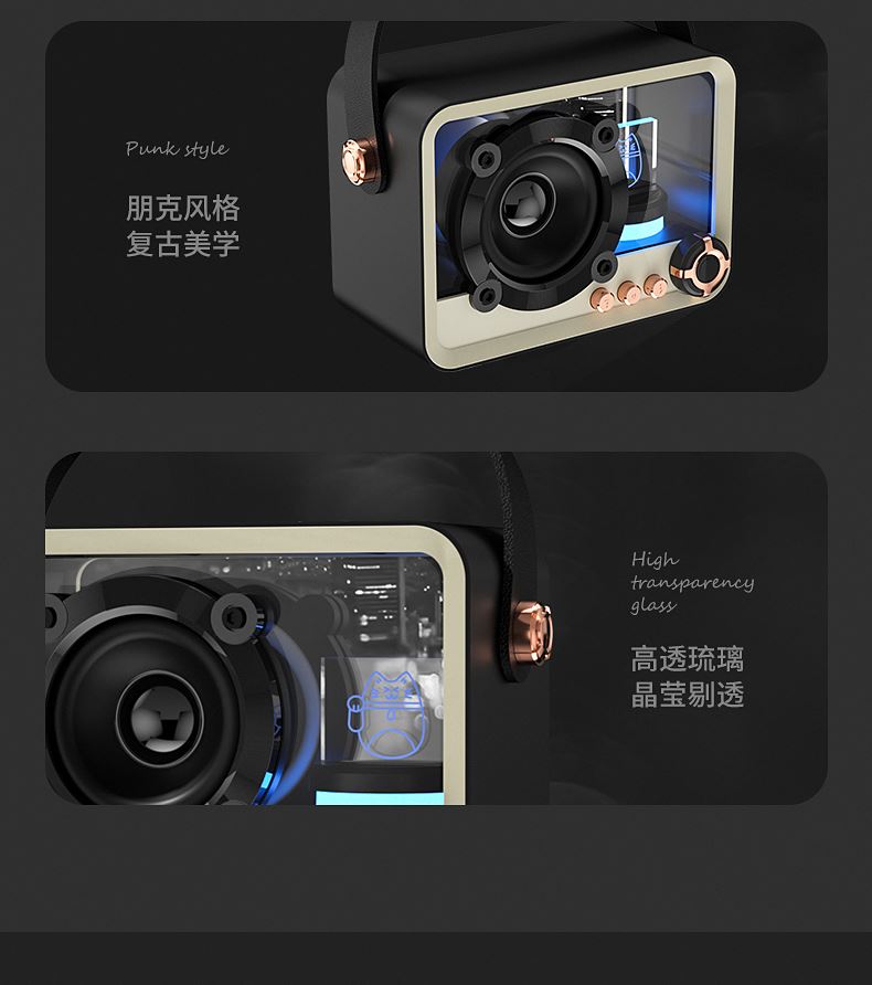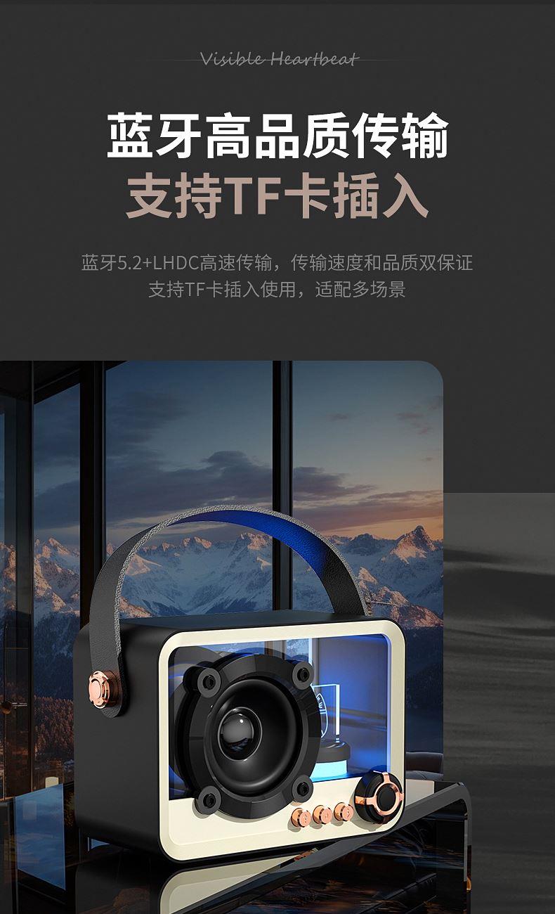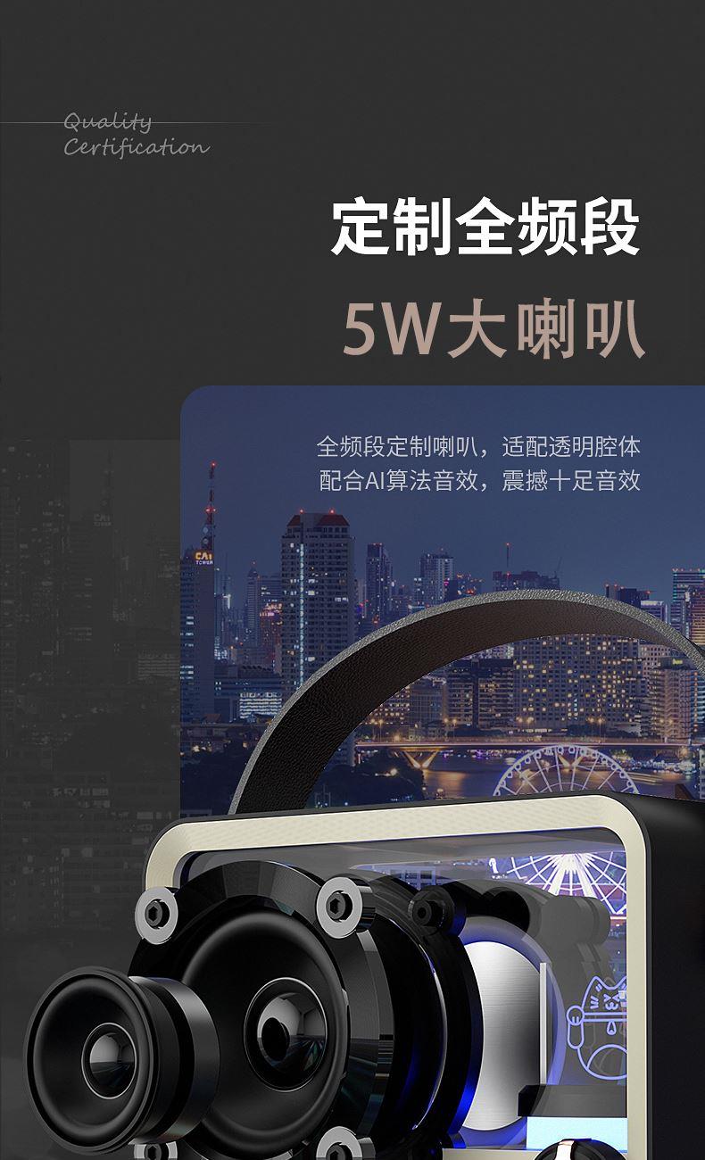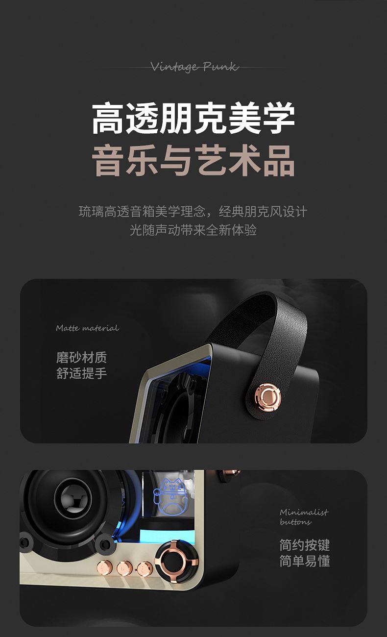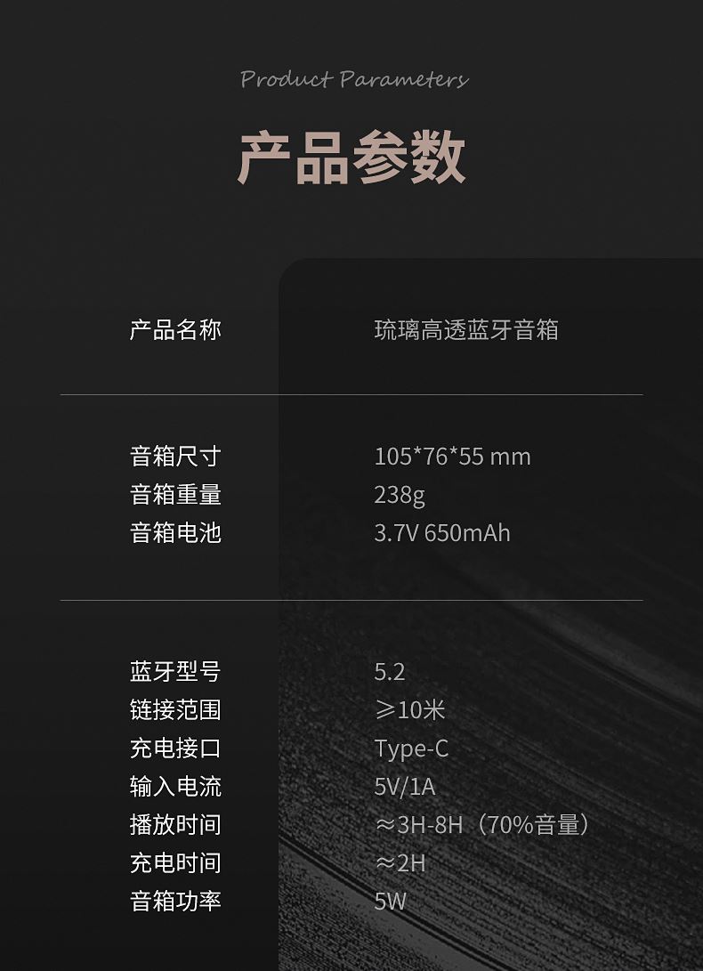 2.琉璃藍(lán)牙音箱 藍(lán)牙5.2方案,5W功率,續(xù)航6小時(shí); 自由選擇藍(lán)牙 / TWS對(duì)聯(lián) / 插卡 / 等播放模式