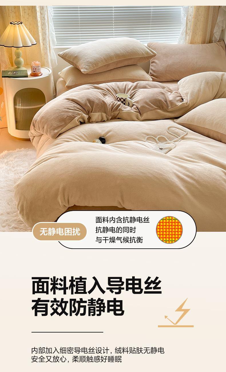 被套:200×230cm 床單:245×250cm 枕套:48×74cm 適用:1.5M-1.8M床 面料:牛奶絨(抗靜電) 風(fēng)格 : 輕奢風(fēng)格 高克重牛奶絨細(xì)密緊實(shí)、柔軟細(xì)膩、加厚保暖、鎖溫蓄熱能力好,告別冬日冷被窩,可以暖呼呼睡個(gè)好覺(jué),獨(dú)享屬于你的私人空間。